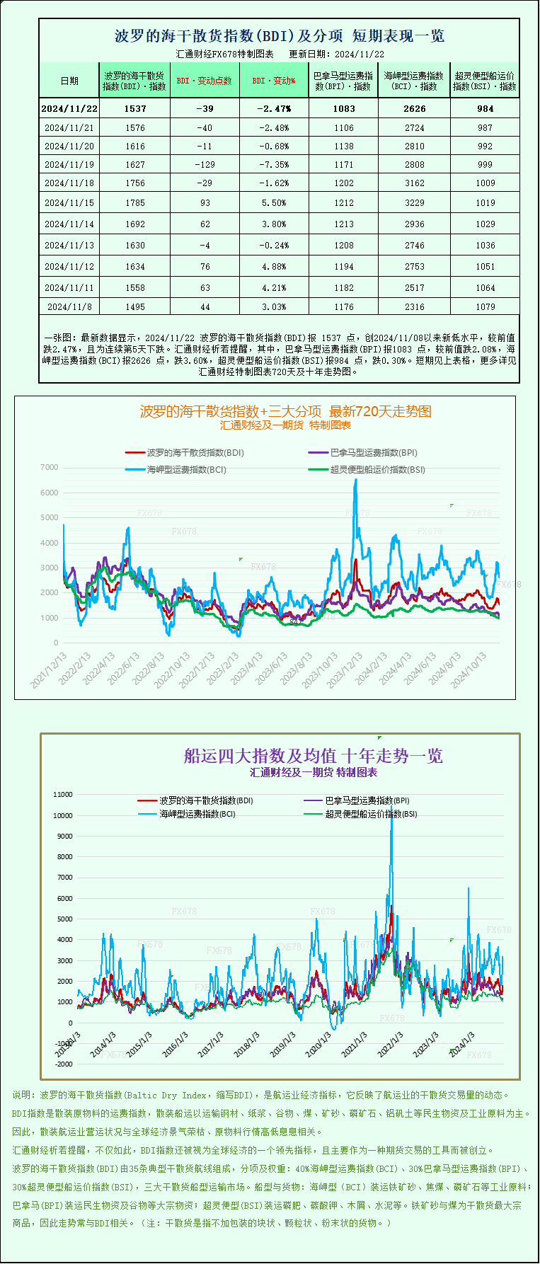 汇通财经APP讯——最新数据显示,2024/11/22波罗的海干散货指数(BDI)报1537点,创2024/11/08以来新低水平,较前值跌2.47%,且为连续第5天下跌。其中,巴拿马型运费指数(BPI)报1083点,较前值跌2.08%,海岬型运费指数(BCI)报2626点,跌3.60%,超灵便型船运价指数(BSI)报984点,跌0.30%。波罗的海干散货指数+三大分项的最新720天走势图、十年走势图等详见汇通财经特制图表。